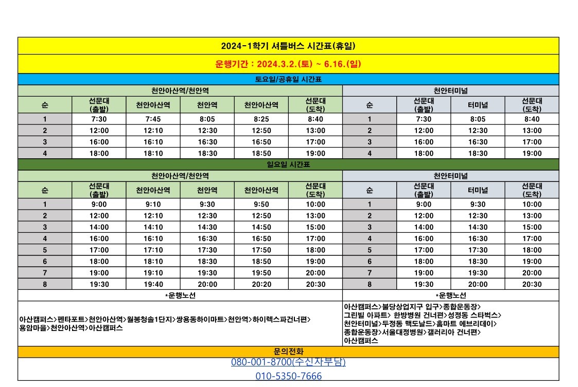 2024년 봄학기 셔틀버스 및 시내버스 시간표를 안내합니다.