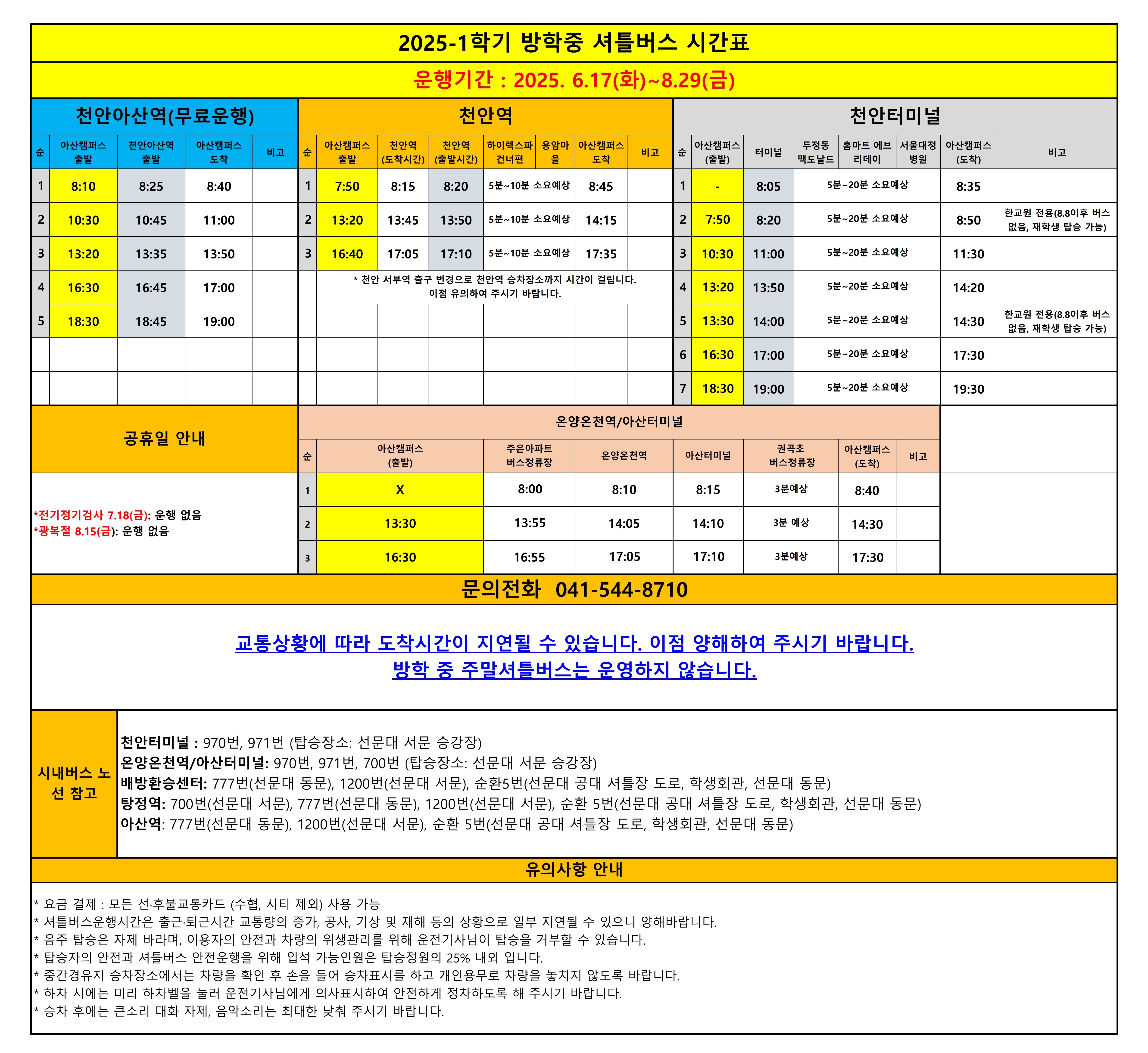 2025년 여름학기 셔틀버스 및 시내버스 시간표를 안내합니다.