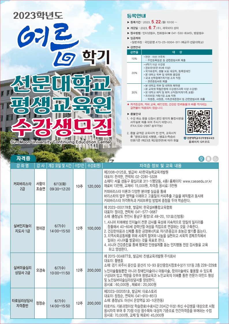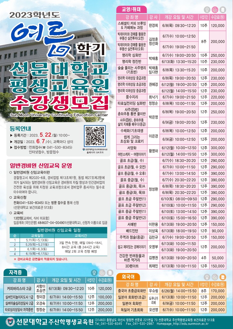 2023년 여름학기 선문대학교 일반강좌 수강생 모집 안내