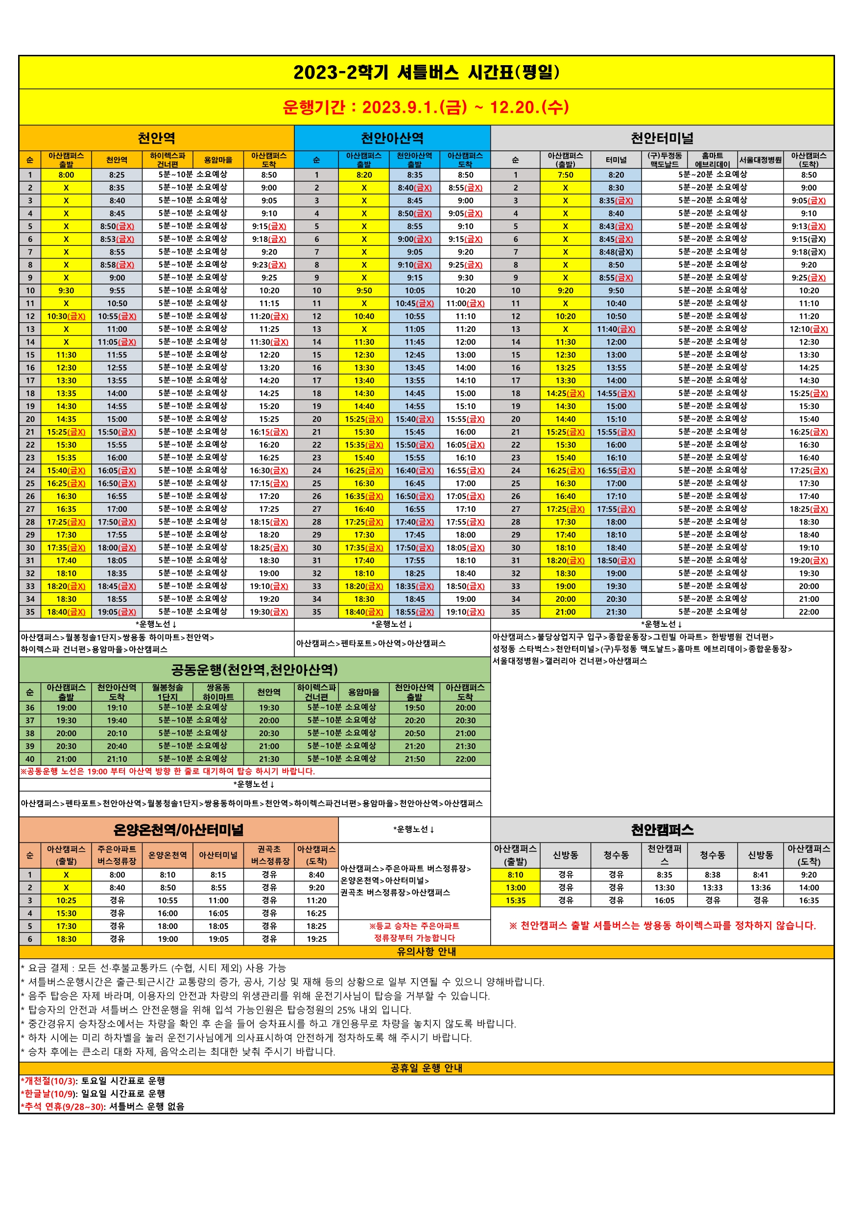 - 개천절(10/3) 토요일 시간표로 운행 , 한글날(10/9) 일요일 시간표로 운행
