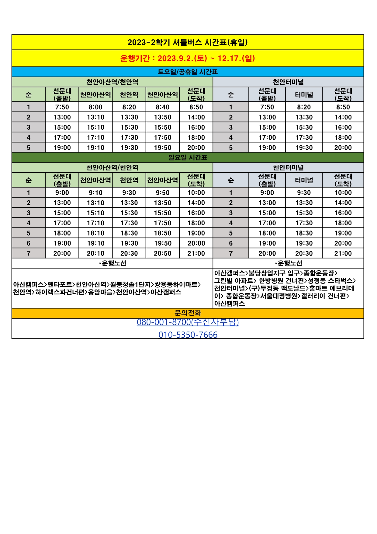 2023년 가을학기 셔틀버스 및 시내버스 시간표를 안내합니다.
