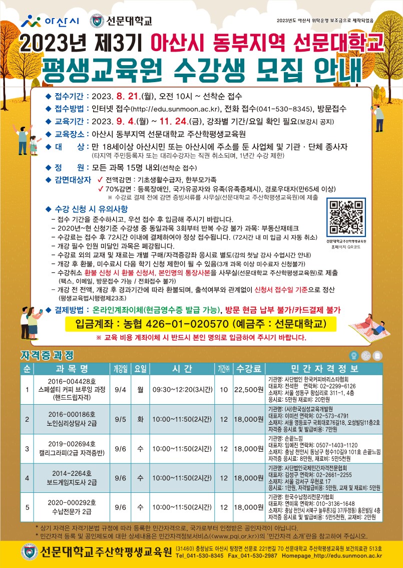 2023년 3기 아산시 동부지역 선문대학교 수강생 모집 안내