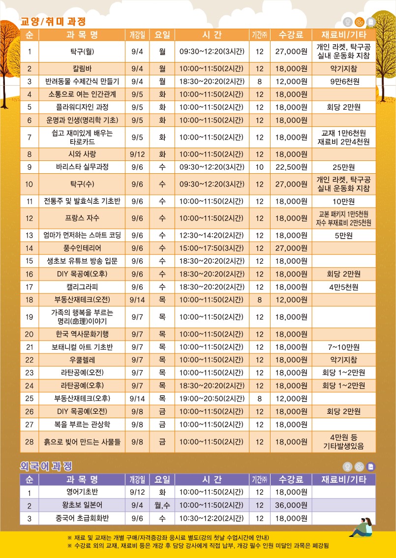 ※ 수업시간, 강의실 등 개강 안내는 신청하신 강좌 전 날 오후 문자발송됩니다.